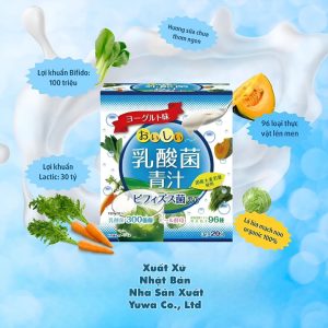 Bột lúa mạch và nước ép trái cây Yuwa từ 100% thiên nhiên, cùng với 75 loại trái cây lên men, 21 loại rau củ và chứa đến 20 tỷ lợi khuẩn axit lactic. Bổ sung Acid Lactic và Bifidobacteria cho những ai có sức khỏe kém, thường xuyên mệt mỏi và gặp các vấn đề về tiêu hóa cũng như bổ sung dinh dưỡng cho cơ thể là hoàn toàn cần thiết. Bột Lá Lúa Mạch Non với Acid Lactic và Bifidobacteria Hỗ trợ điều trị một số bệnh như tiêu chảy, đầy bụng, người không thể tiêu hóa Lactos, táo bón,..